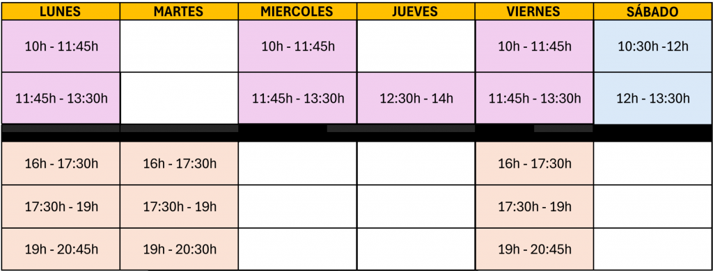 Si no puedes asistir a un horario fijo ¡estás de suerte! Con nuestros bonos de clases puedes adaptarte a los horarios que mas te convengan. Pregunta por ellos en nuestro email o teléfono de contacto.